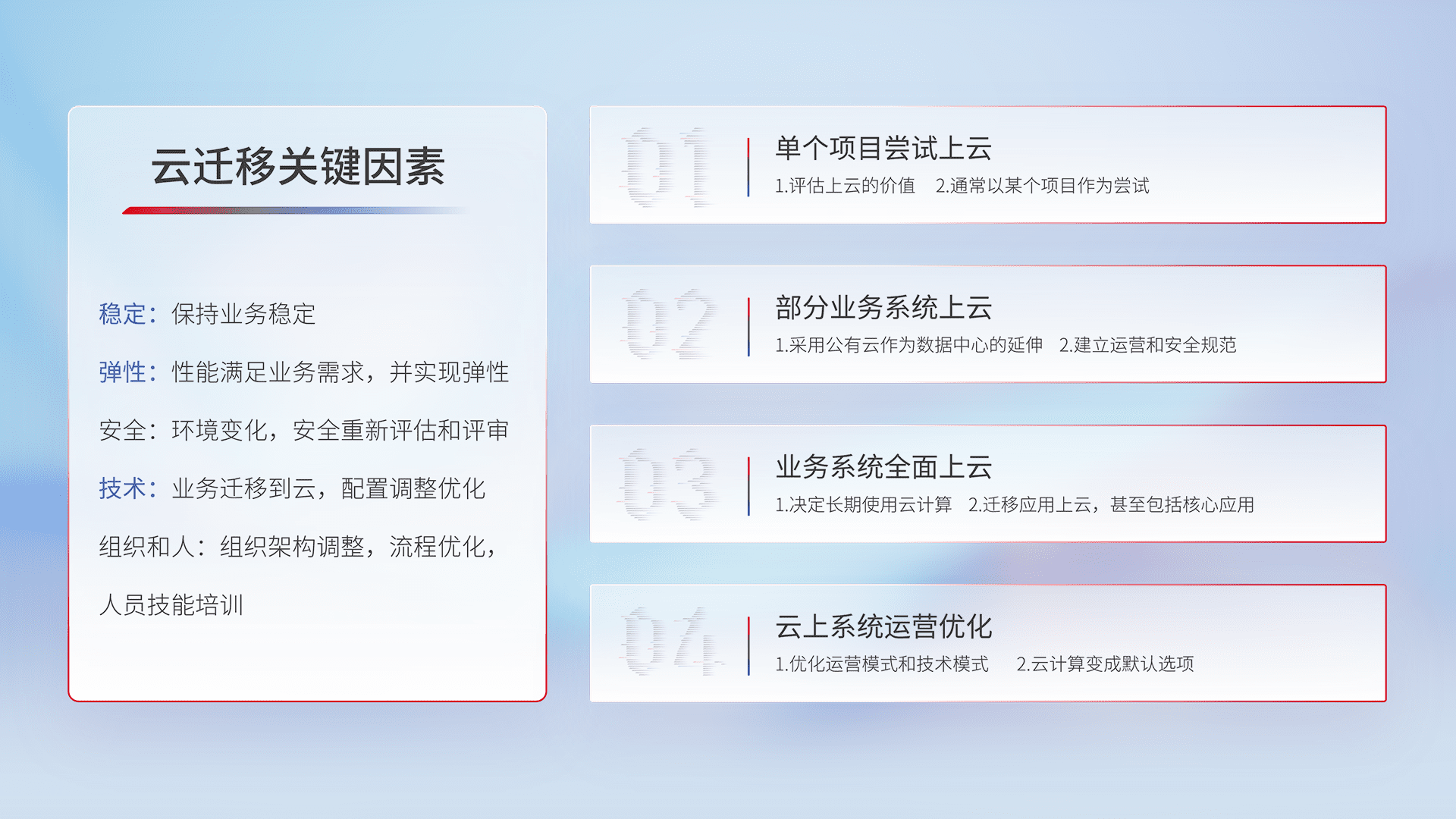 结合实际业务,,,,从规划设计、、云平台选型、、、、云原生改造、、、、数据迁移、、、、集成交付,,迁移全过程为客户识别最佳上云路径,,做好风险识别管理,,,,设计网络架构、、、身份权限、、、、安全审计合规、、操作审计、、日志审计、、监控告警策略、、、、多站点容灾设计等,,,,对云上基础设施进行整体规划,,,,提升IT治理水平,,,以满足弹性、、、、高可用、、、高性能的需求。。