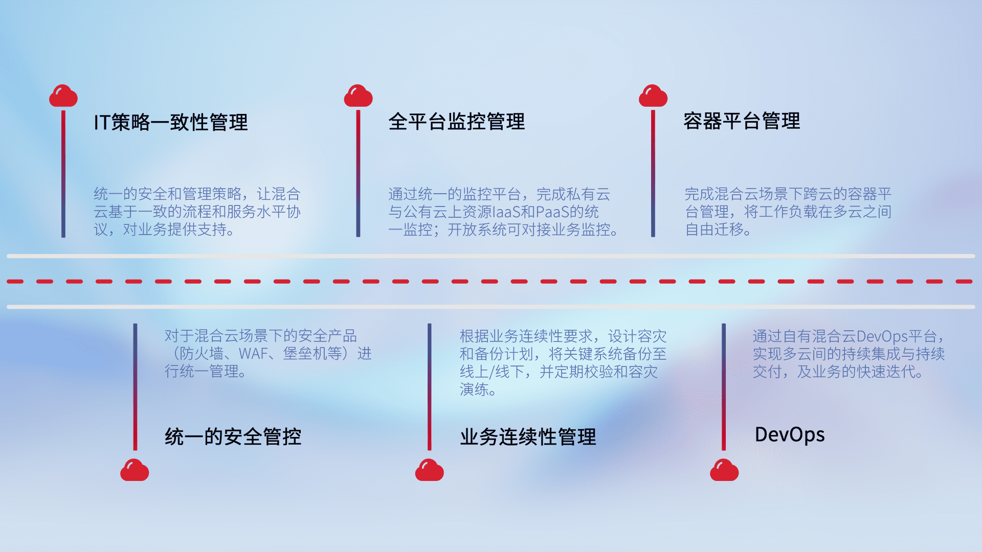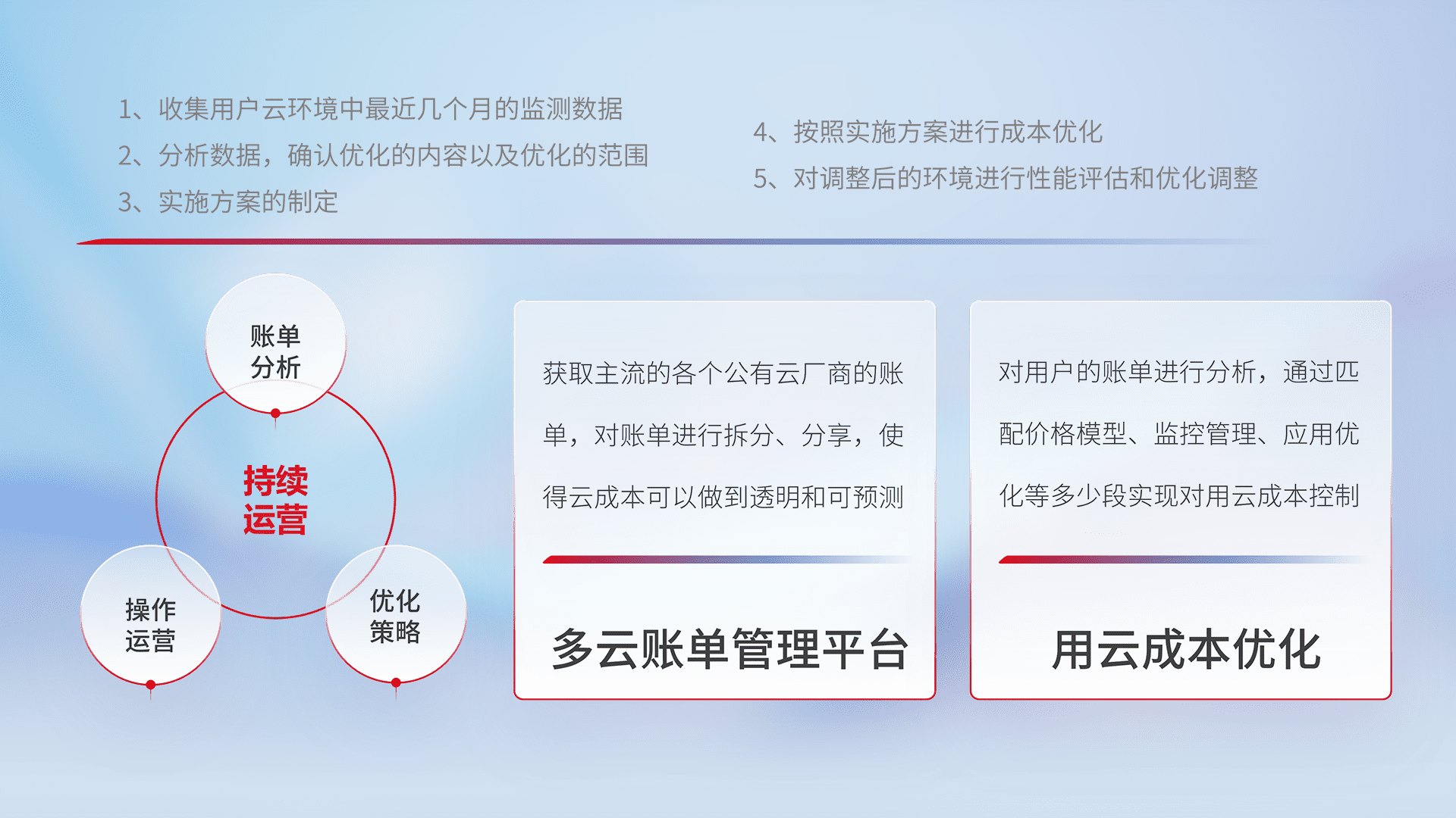 通过多云纳管,,,以统一的资源数据模型把客户的云资源进行抽象和封装,,进而实现对多云资源的统一操作,,,,保障云资源管理的可靠性、、、稳定性与可用性。。。。量身定制化运维内容,,配置、、、开发运维、、、、补丁管理、、备份、、、、监控、、、、认证和访问管理、、、、审计和日常巡检等,,,,保障在用云过程中的可靠度,,稳定度以及高可用率。。。